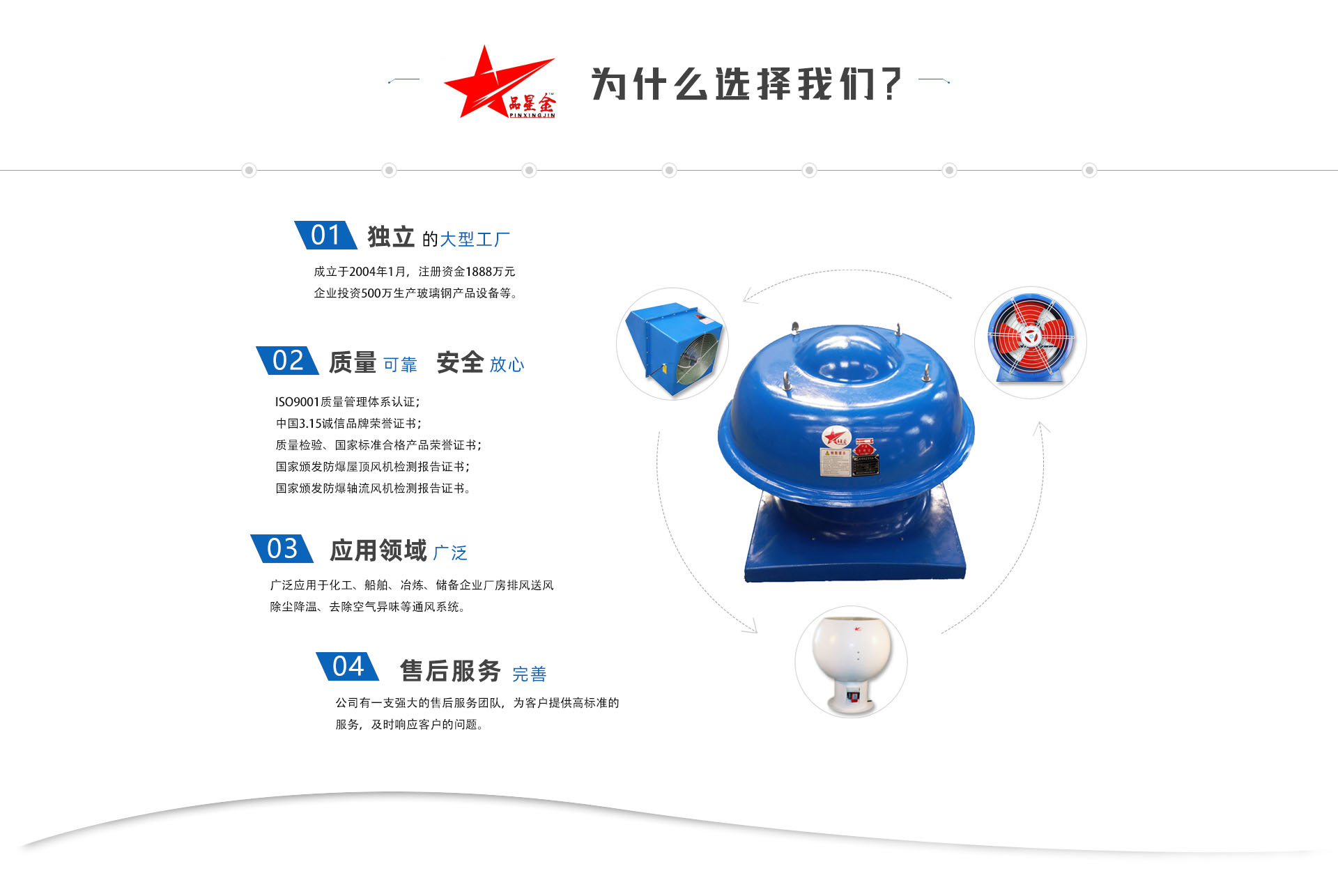 公司生產(chǎn)屋頂風(fēng)機(jī)、玻璃鋼防爆屋頂風(fēng)機(jī)、玻璃鋼防爆軸流風(fēng)機(jī)、玻璃鋼防爆邊墻風(fēng)機(jī)、防爆軸流風(fēng)機(jī)、玻璃鋼斜流風(fēng)機(jī) 、玻璃鋼離心風(fēng)機(jī) 、玻璃鋼防雷防爆電動(dòng)風(fēng)帽 、玻璃排氣扇 、玻璃鋼通風(fēng)器 、玻璃鋼防雨風(fēng)機(jī)帽 、玻璃鋼冷卻塔、新風(fēng)機(jī)組、風(fēng)機(jī)盤(pán)管、風(fēng)量調(diào)節(jié)閥、鋁合金風(fēng)口 、各種材質(zhì)通風(fēng)管道、等產(chǎn)品。
